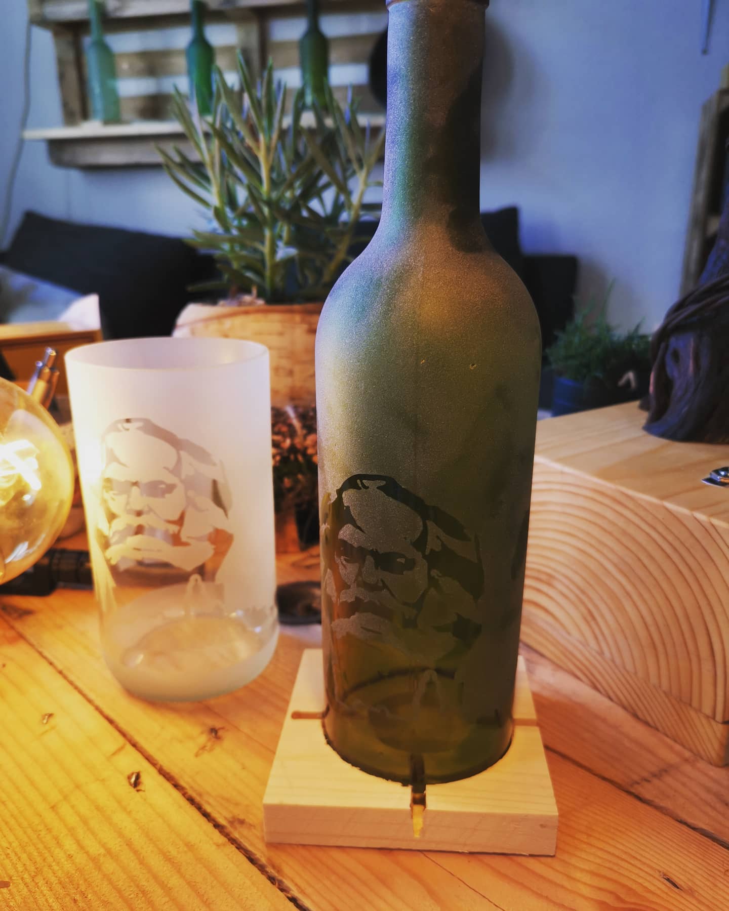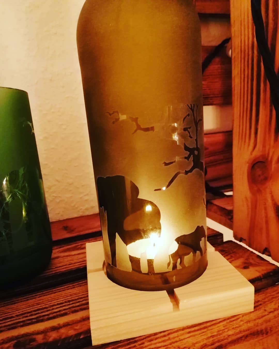Handgefertigt aus recycelten Glasflaschen sind diese Windlichter ein echter Blickfang. Den Flaschen wird fachgerecht der Boden entfernt, die Kanten geschliffen und mit einem Motiv deiner Wahl versehen.