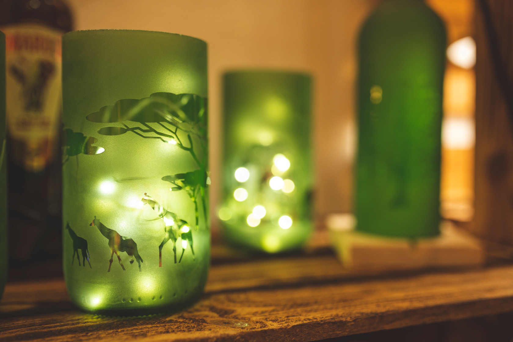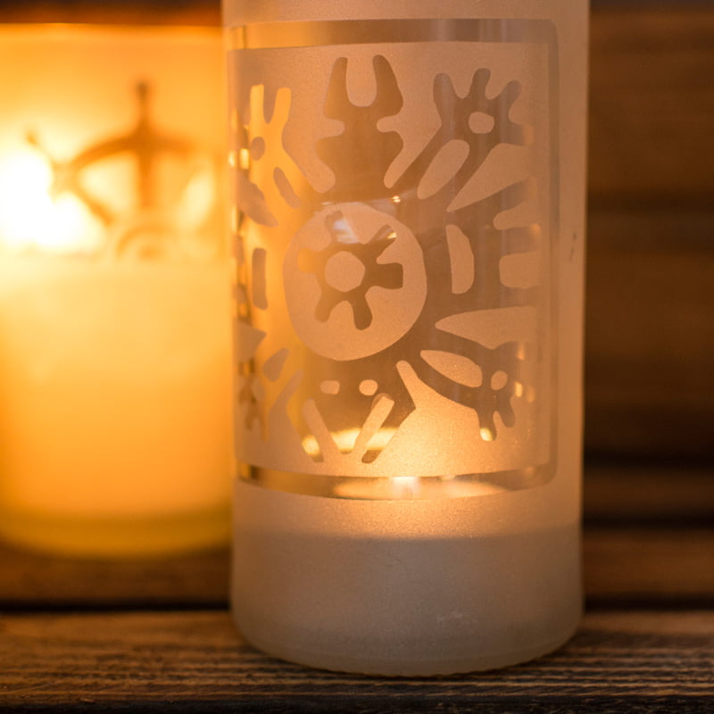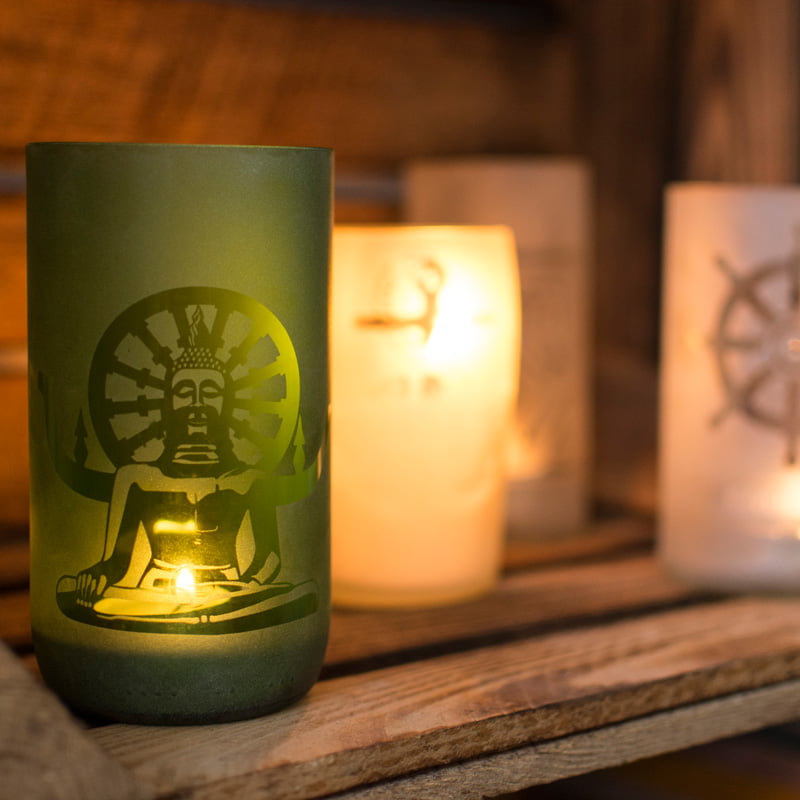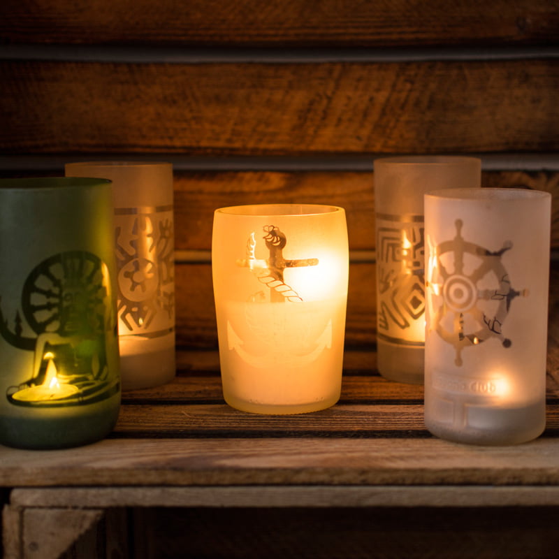 Handgefertigt aus recycelten Glasflaschen sind diese Windlichter ein echter Blickfang.Den Flaschen wird fachgerecht der Hals entfernt, die Kanten geschliffen und mit einem Motiv deiner Wahl versehen.
